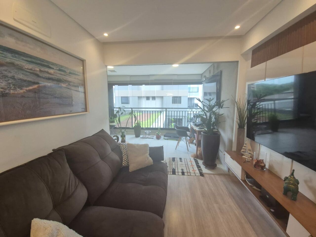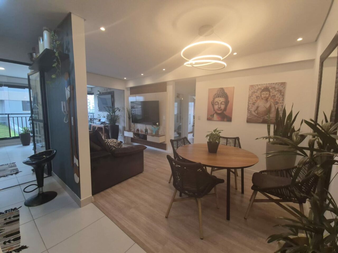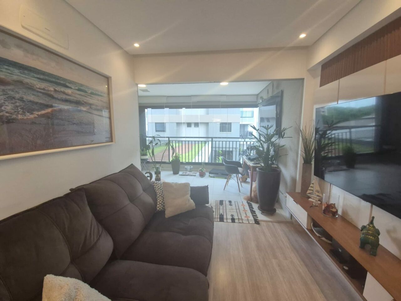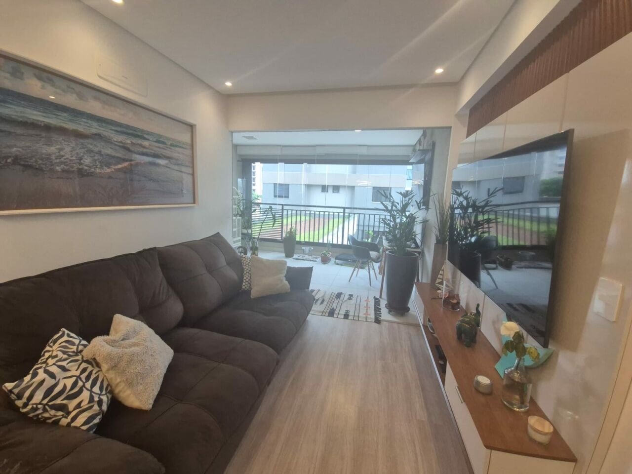 Sala estendida integrada à varanda em conceito aberto, perfeita para momentos de convivência.