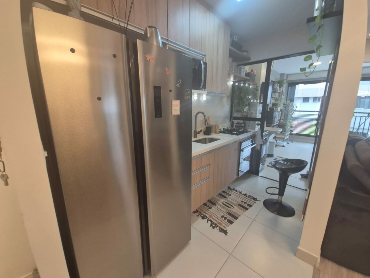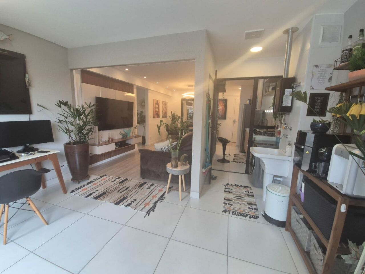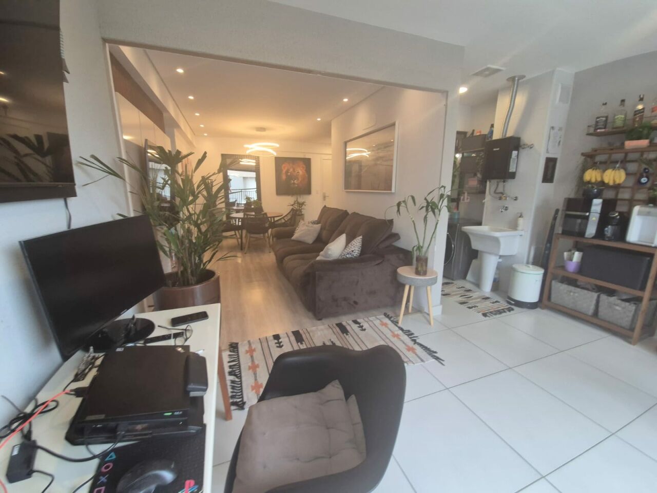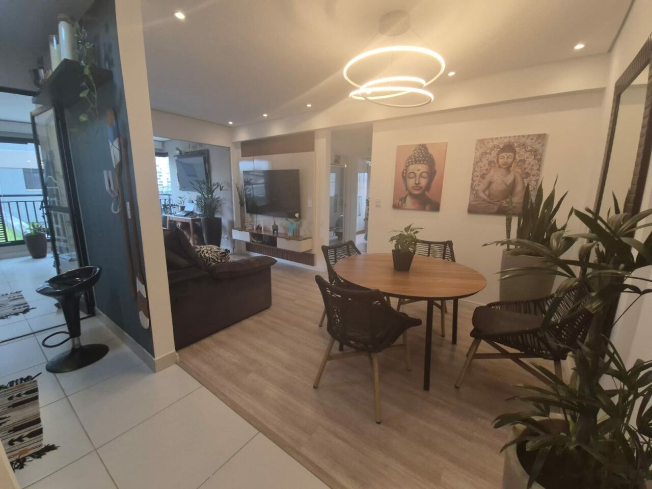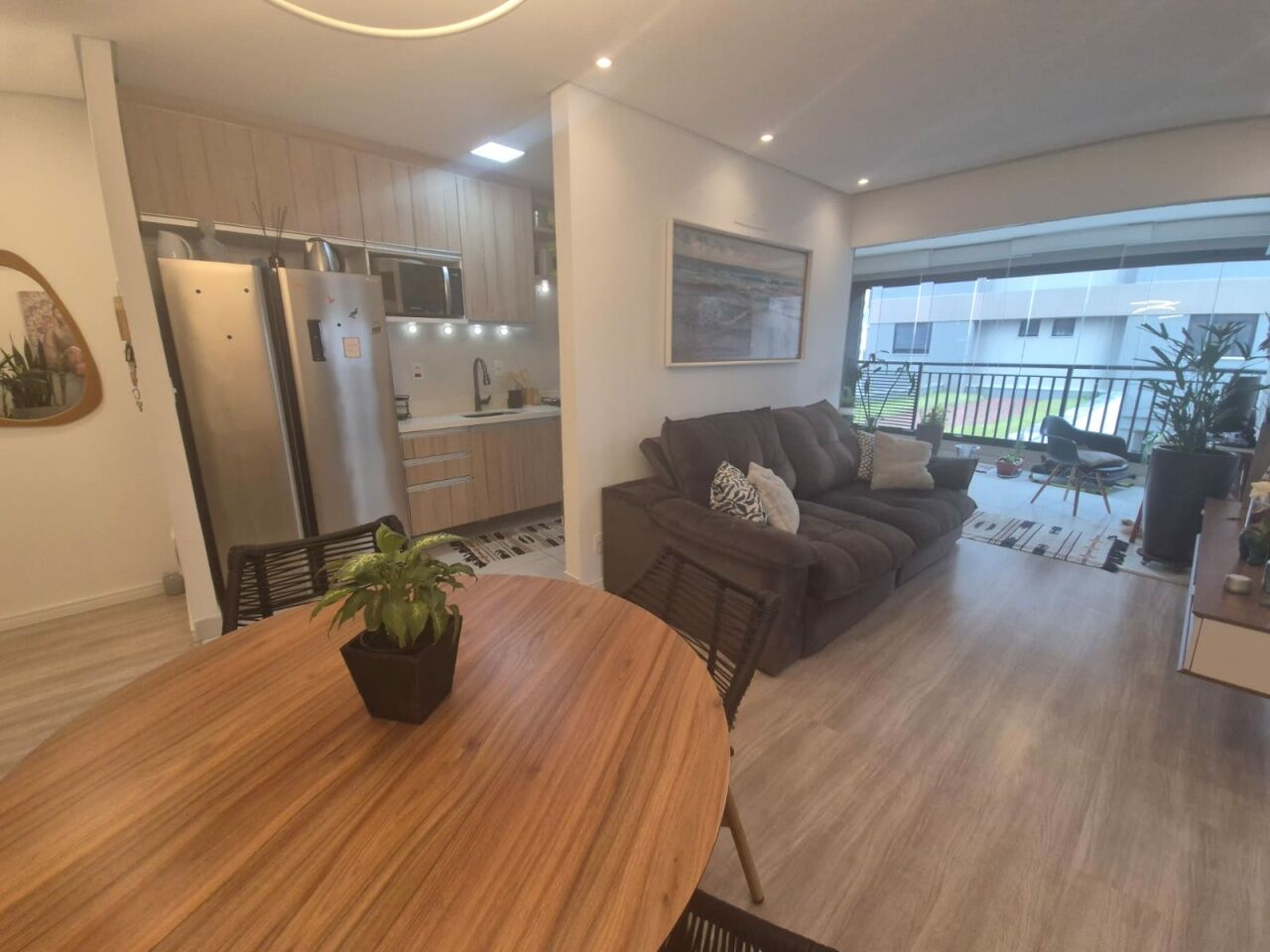 Sala estendida integrada à varanda em conceito aberto, perfeita para momentos de convivência.